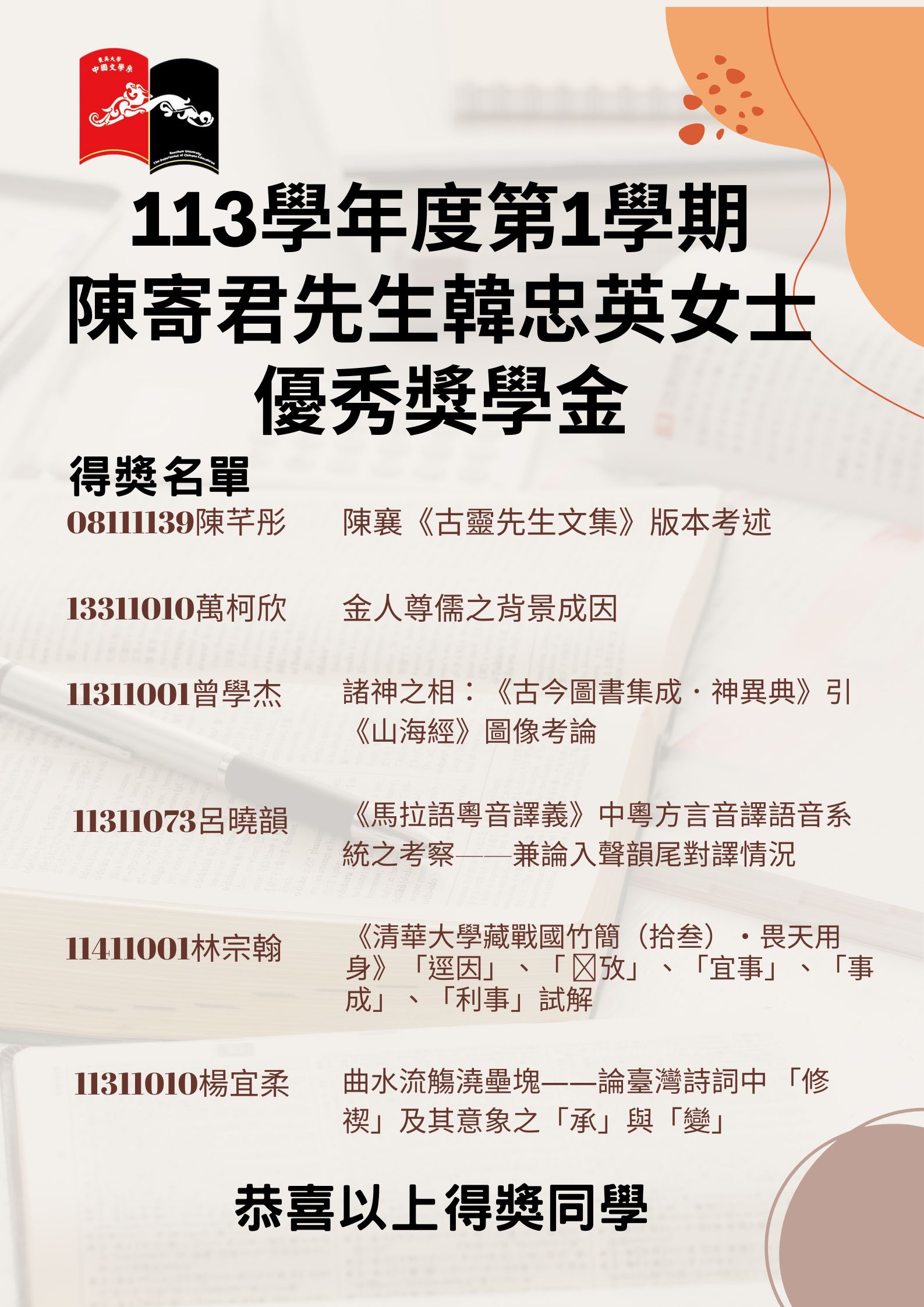 113學年度第1學期 陳寄君先生/韓忠英女士優秀獎學金得獎名單。