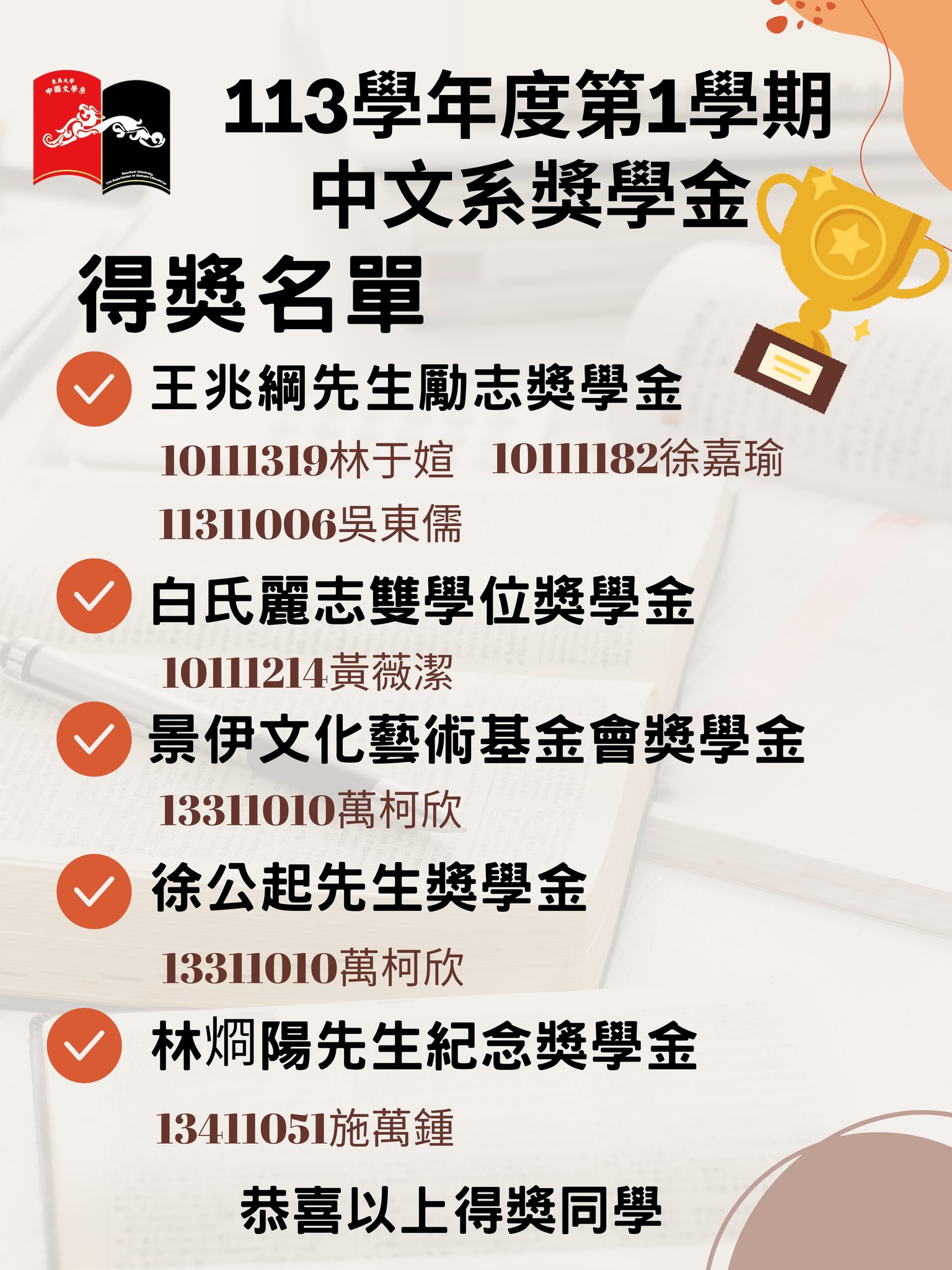 113學年度第1學期 中文系各項獎學金得獎名單公告。