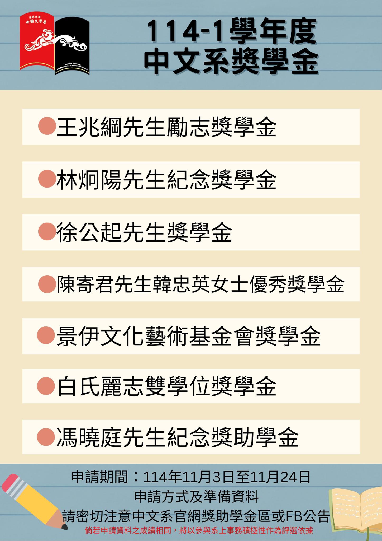 114學年度第1學期 中文系各項獎學金受理公告。