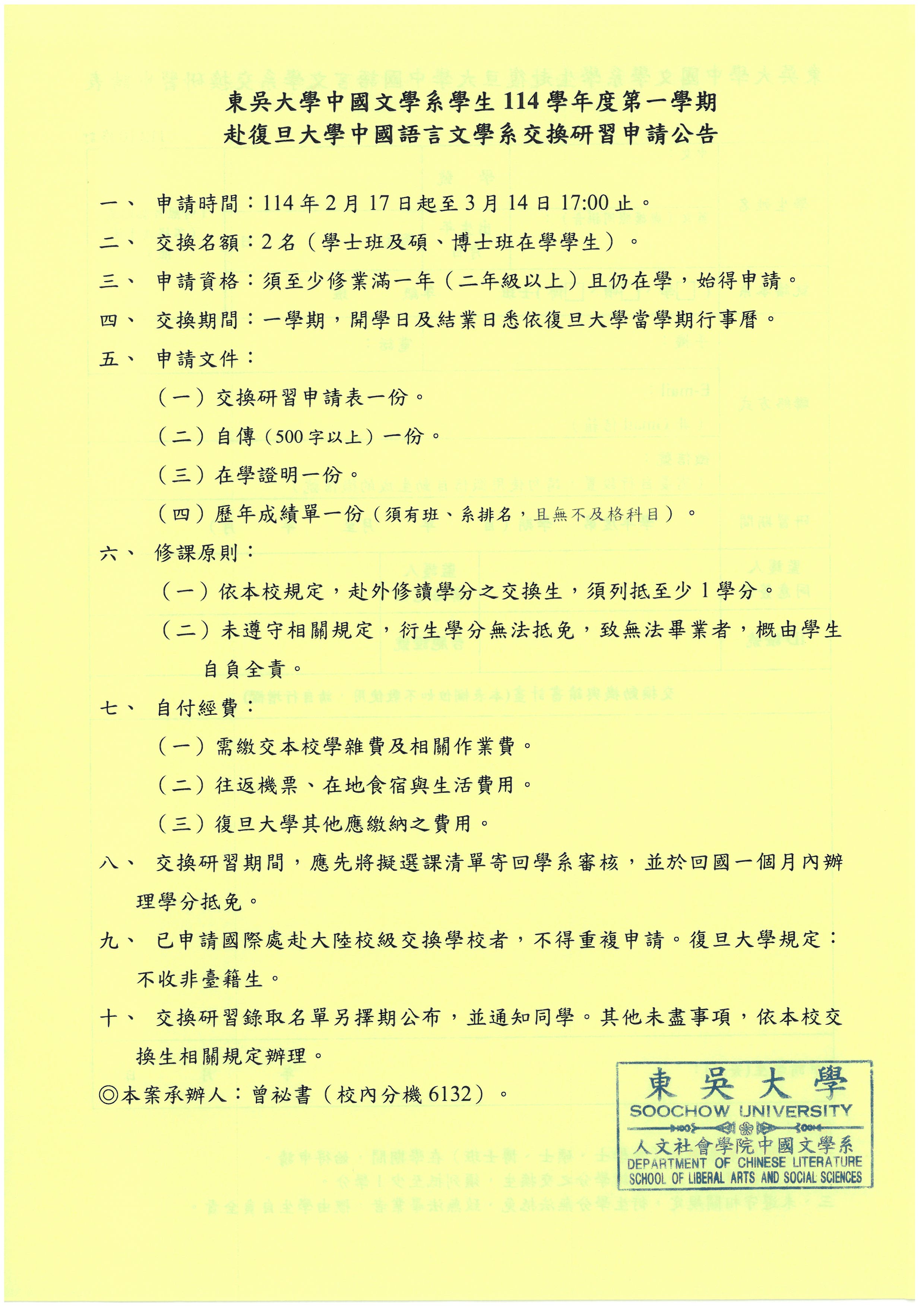本系114學年度第一學期學生赴復旦大學中國語言文學系交換研習公告。