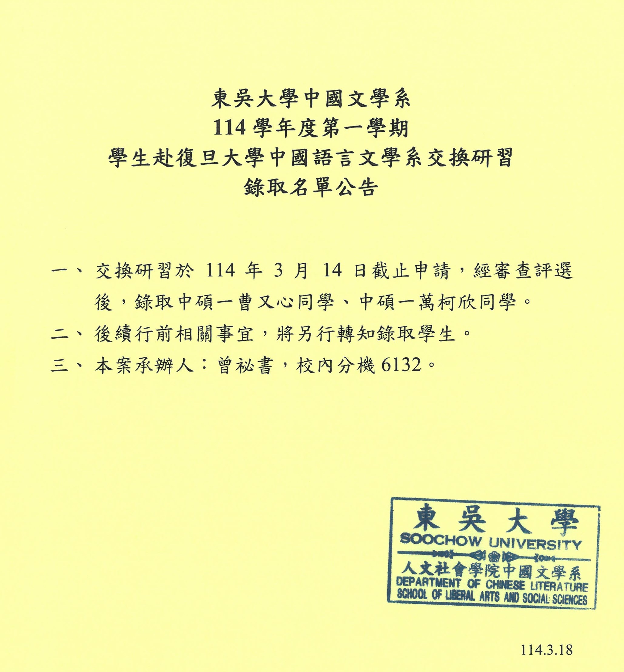 本系114學年度第一學期學生赴復旦大學中國語言文學系交換研習錄取名單公告。
