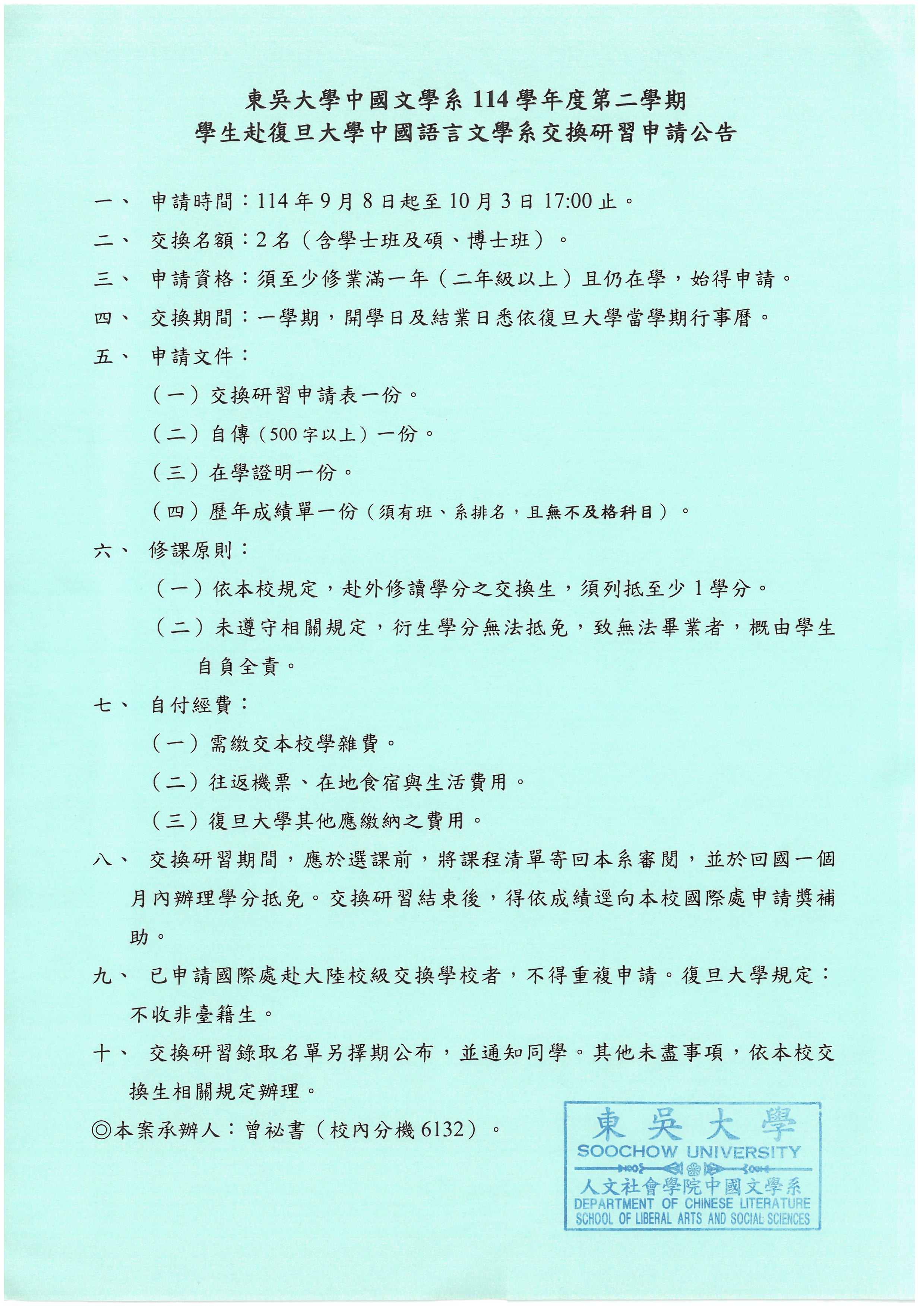 本系114學年度第二學期學生赴復旦大學中國語言文學系交換研習公告。