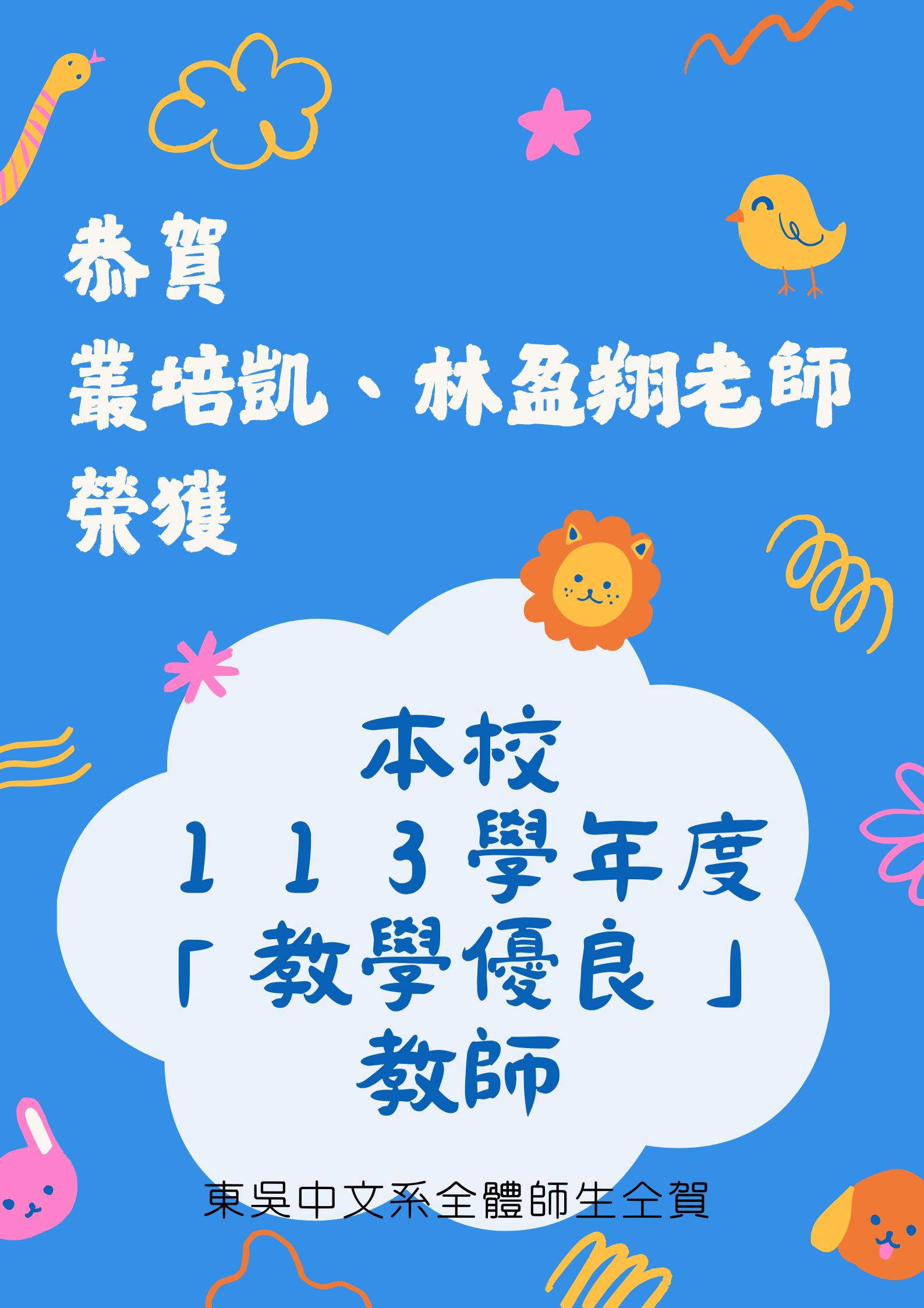 恭賀!本系叢培凱、林盈翔2位老師榮獲本校113學年度「教學優良」教師。
