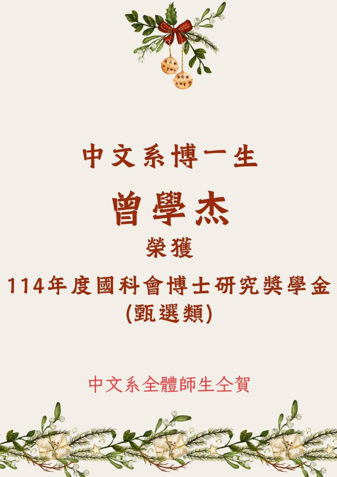 恭賀!中博一 曾學杰榮獲國科會114年度博士研究獎學金(甄選類)。