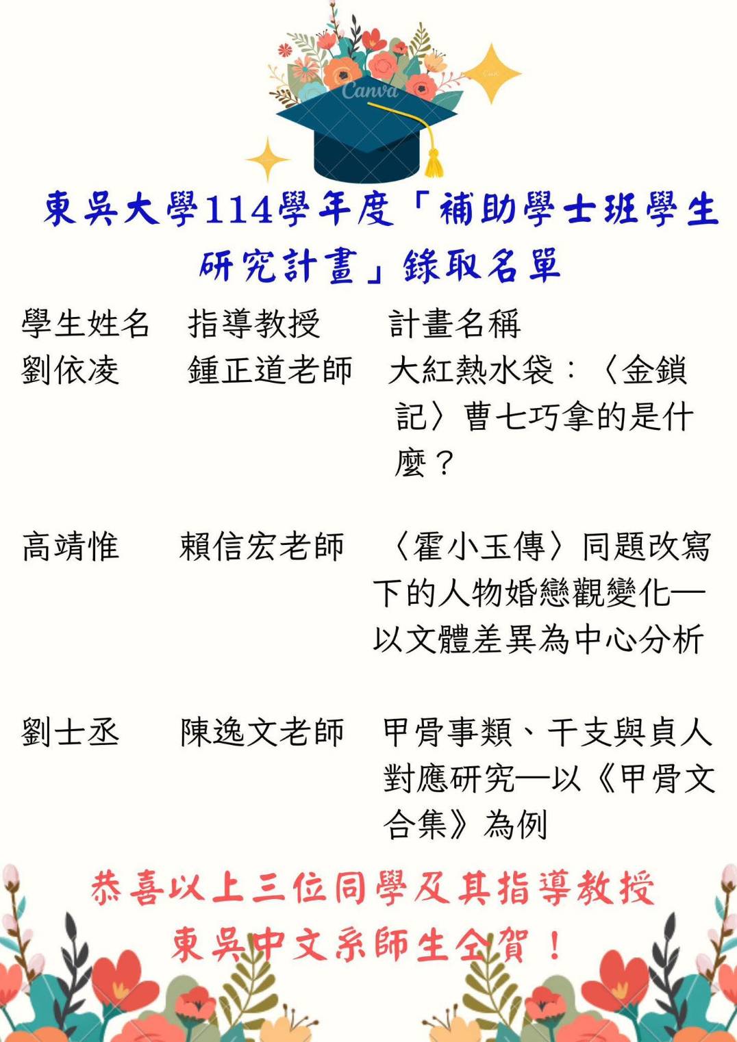 恭賀!劉依凌、高靖惟、劉士丞通過本校114學年度「補助學士班學生研究計畫」。