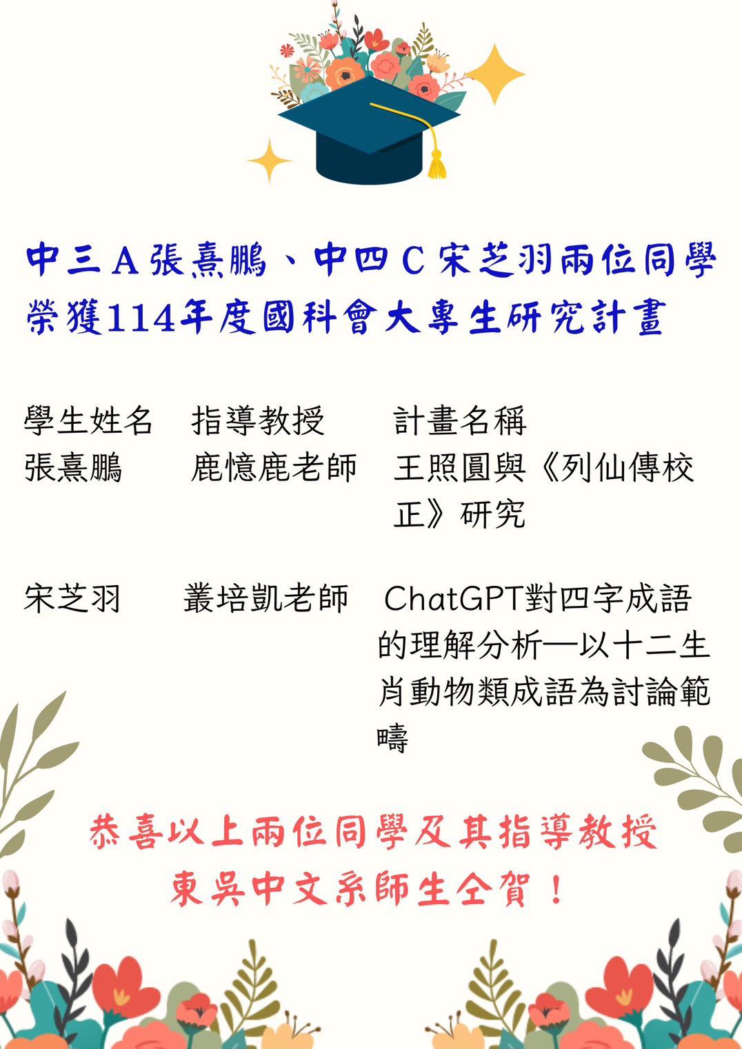 恭賀!張熹鵬、宋芝羽通過國科會114年度大專學生研究計畫。