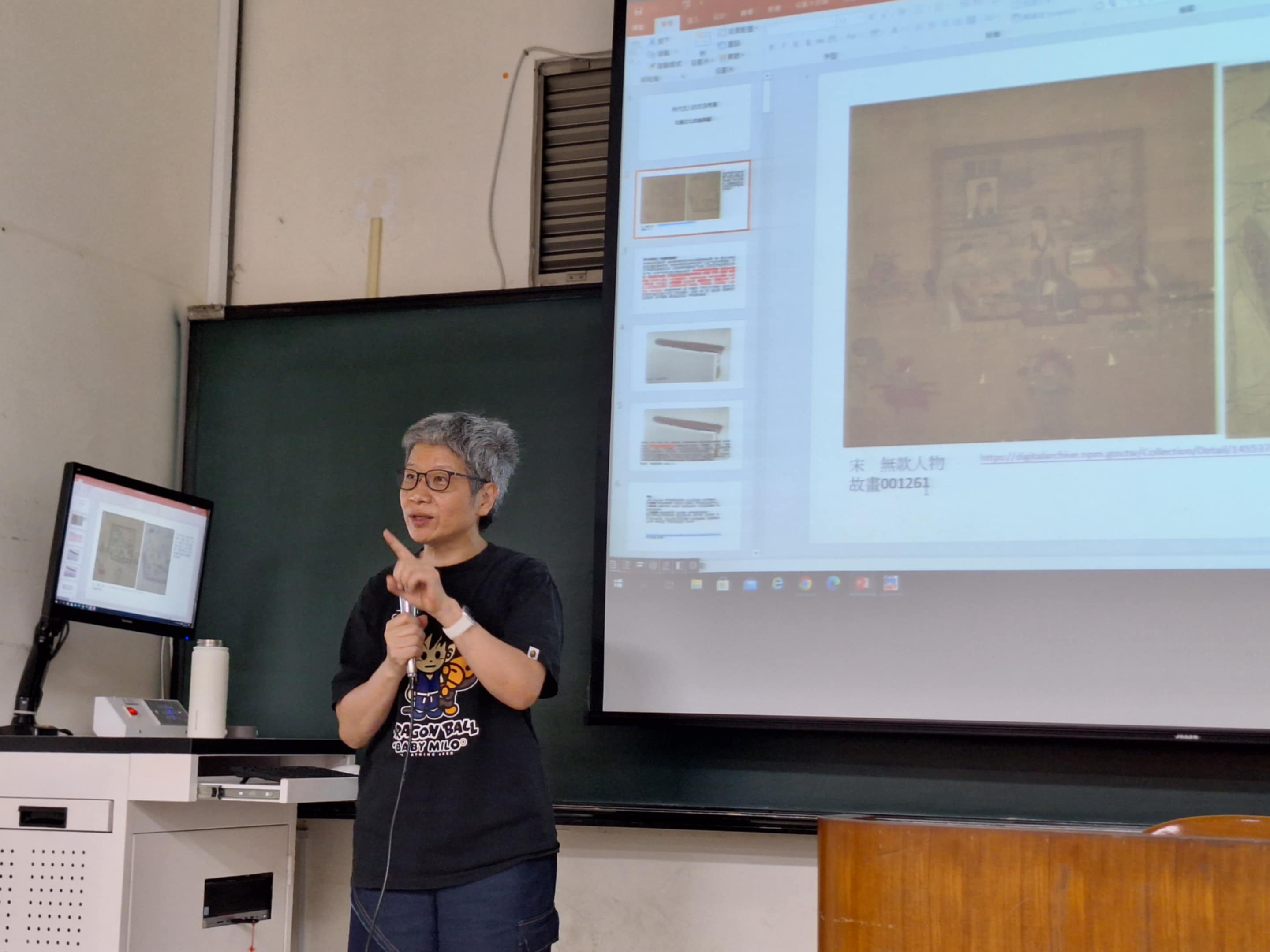 燈光微暗,隨著科長陳慧霞沈穩的嗓音,投影片緩緩亮起,首先映入眼簾的是一幅無款的人物圖。畫面中,一位宋代文人靜坐於桌案前,身著寬袍大袖,雙腿盤坐,神態從容,目光低垂,左手輕扶桌角,褐色袍角自然垂落,衣袂翻飛之間,蘊藏著端方自持的閒適與自在。陳科長指出,這種坐姿既非禮儀上的矯飾,亦非浮於外在的形象,而是一種心神內歛、與器物共處的體現;畫中人物,留著髮上髻,頭戴透紗帽,真實呈現人物神態,畫師以最質樸的筆法勾勒出自在、內斂的文人風範,是宋人書齋生活的縮影。在宋代,書齋不僅是讀書與寫作的空間,更是一處靈魂可棲、精神得以安放之處。
