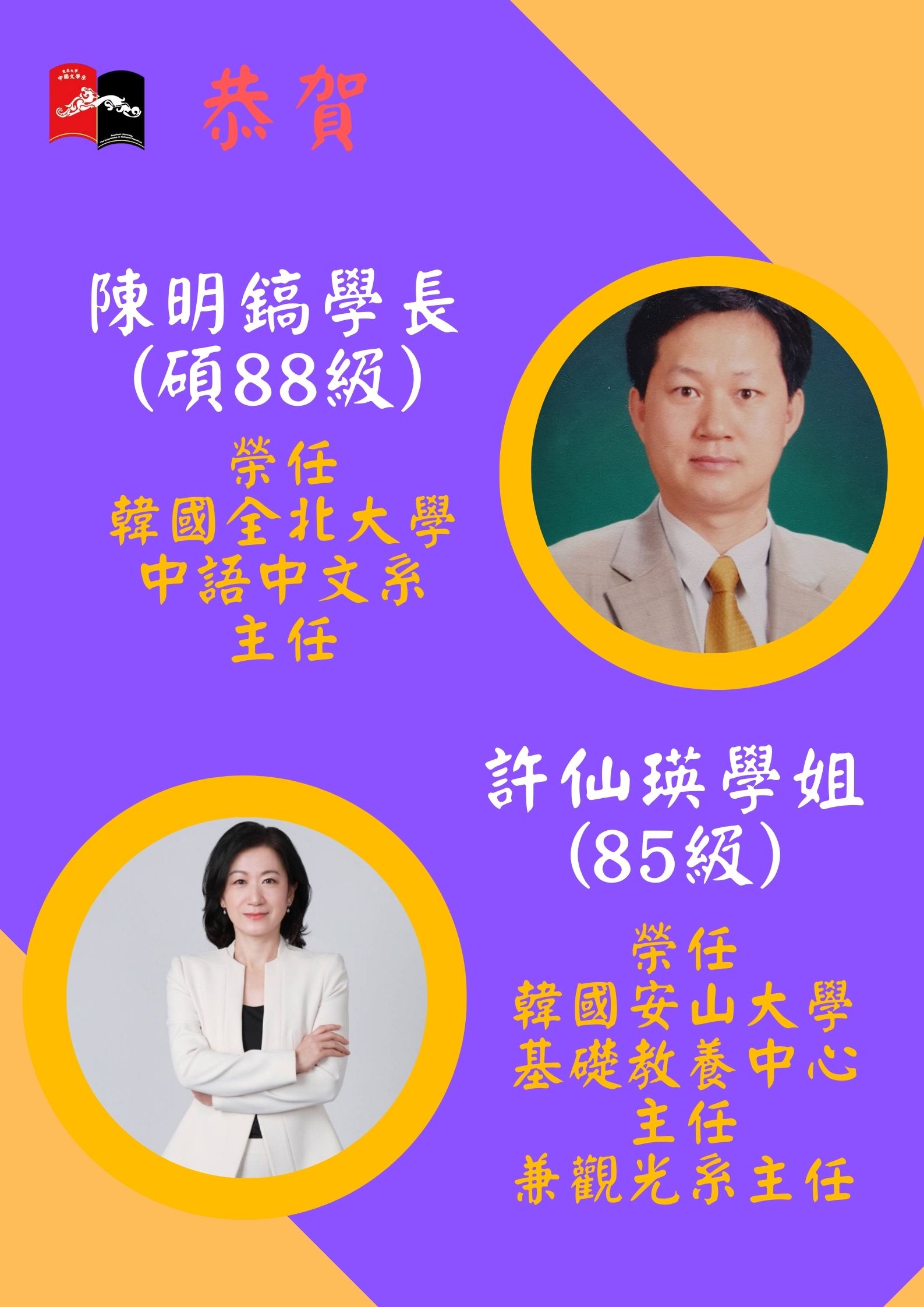 恭賀:陳明鎬學長榮任韓國全北大學中語中文系主任;許仙瑛學姐榮任韓國安山大學基礎教養中心主任。