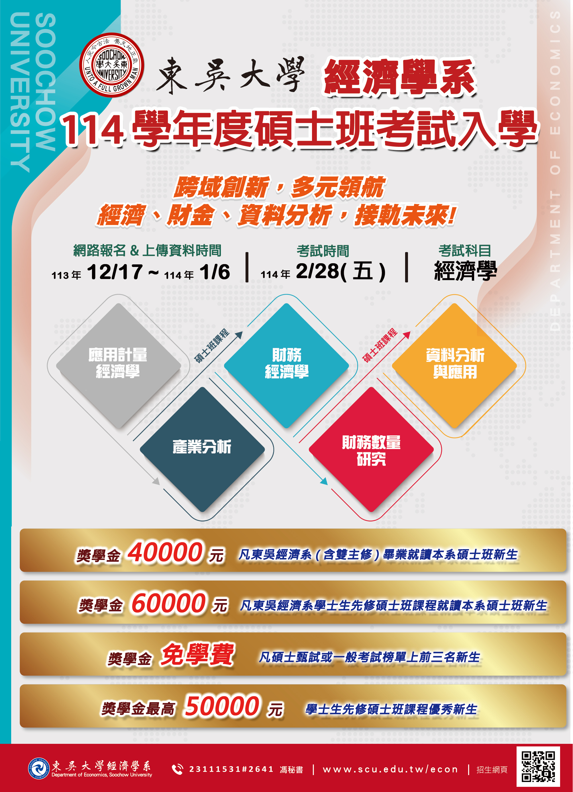 東吳大學114學年度經濟學系碩士班考試開始報名