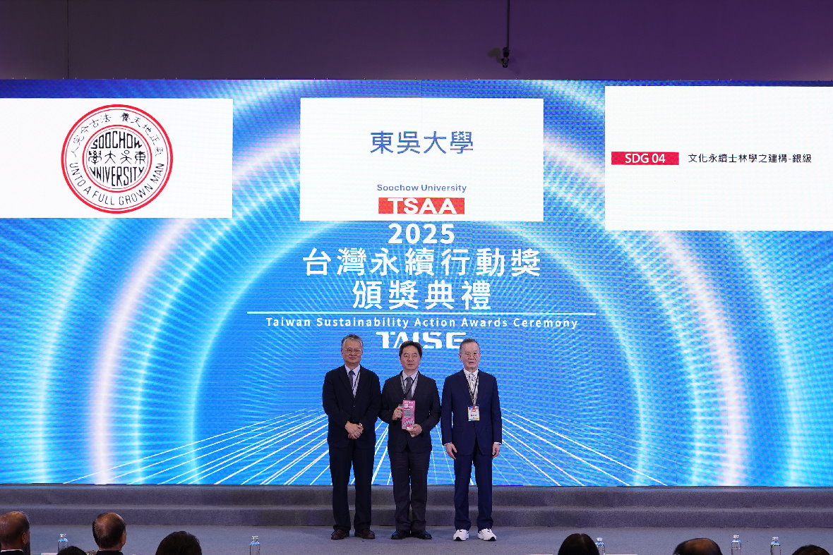 由財團法人台灣永續能源研究基金會(TAISE)辦理之「2025亞太暨台灣永續行動獎」,於2025年2至8月徵獎並完成評選,本校政治學系黃秀端老師主持的「文化永續 士林學之建構」計畫呼應聯合國永續發展目標(SDGs)之「永續城市及社區」項目,榮獲台灣永續行動獎銀獎。頒獎典禮於2025年9月11日舉行,由王世和副校長代表領獎。