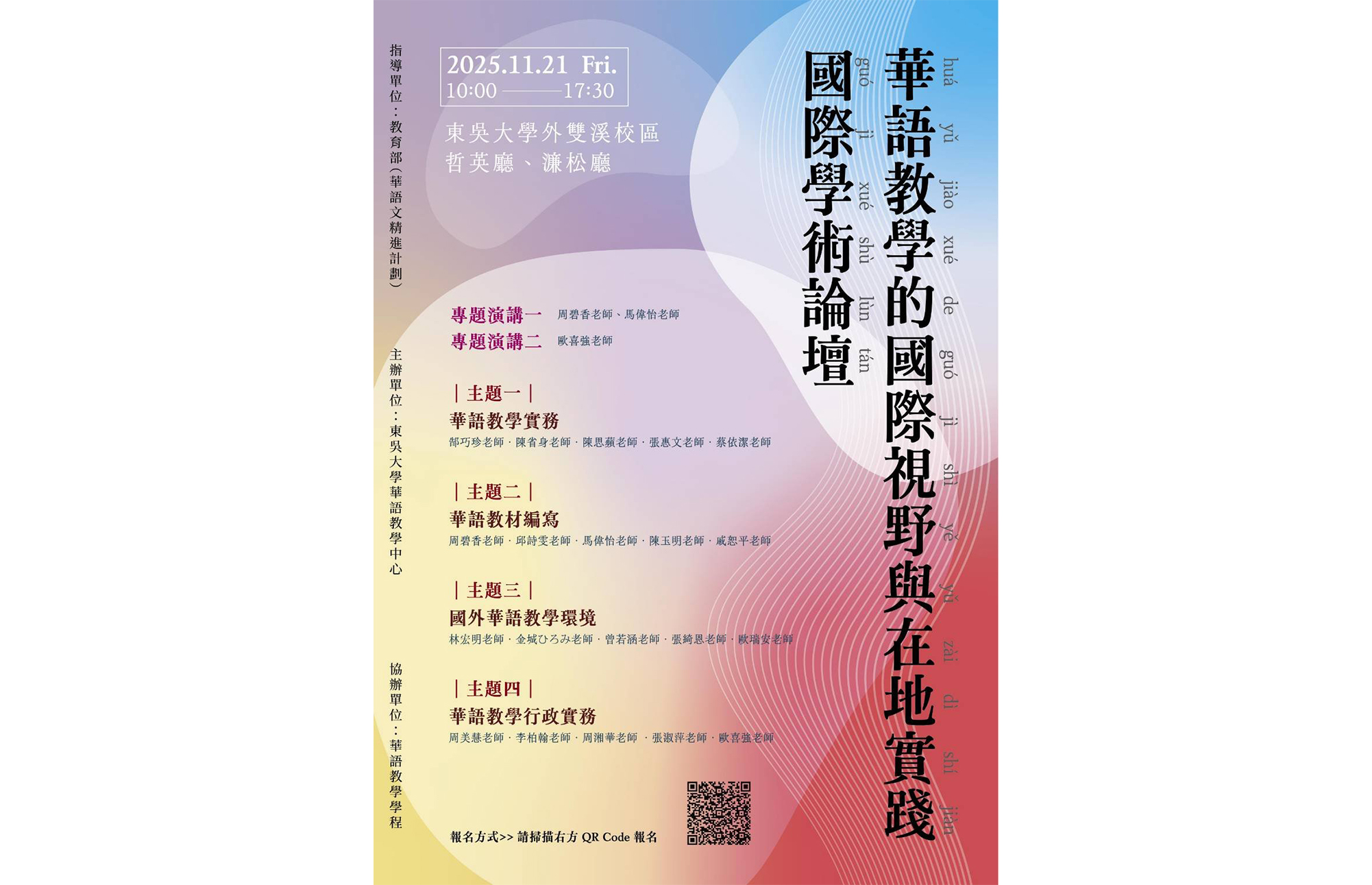 本校華語教學中心與中文系華語教學學程於 114年11月21日共同執行教育部「外國學生華語文能力精進計畫」,舉辦「華語教學的國際視野與在地實踐」國際學術論壇。論壇由華語中心林宜陵主任與中文系叢培凱老師及陳逸文老師擔任主要策劃與統籌。本次論壇邀請到來自國內外共20位華語教學專家,分享研究與實務經驗,深化華語教育與促進國際交流。