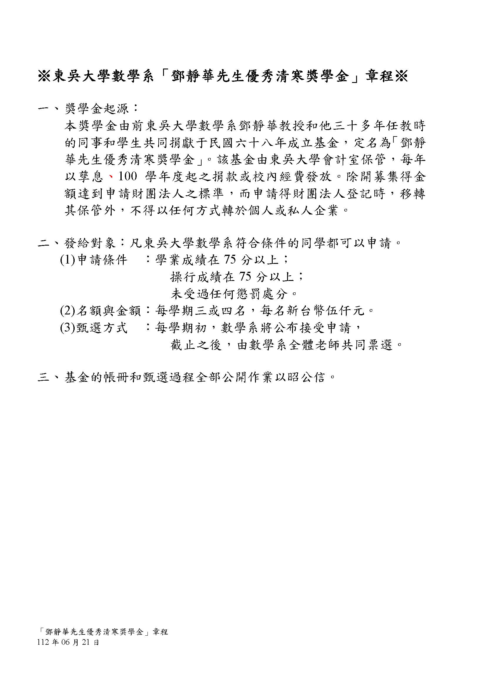 東吳大學數學系「鄧靜華先生優秀清寒獎學金」章程.pdf