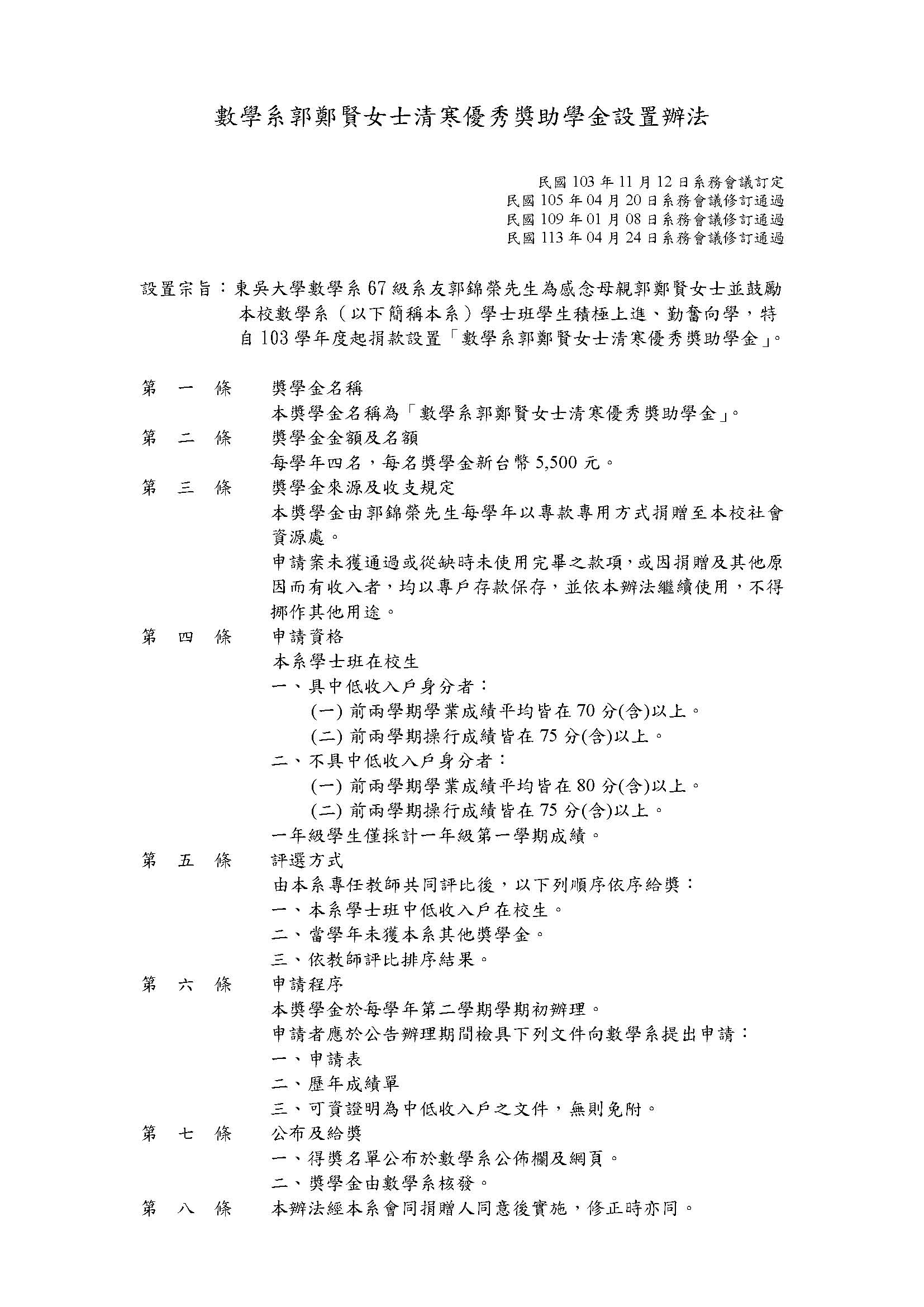 「數學系郭鄭賢女士清寒優秀獎助學金」實施辦法