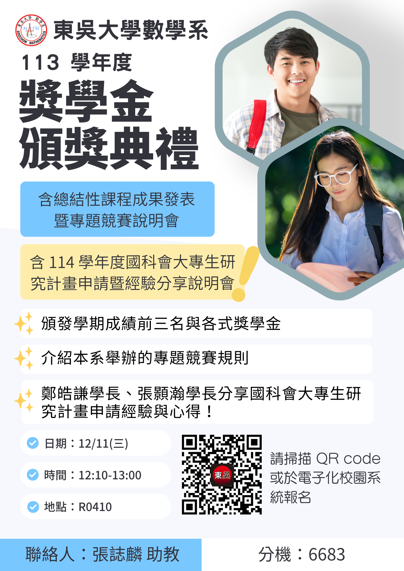 【數學系輔導活動】114學年度國科會大專生研究計畫申請暨經驗分享說明會 (含113學年度獎學金頒獎典禮、總結性課程成果發表暨專題競賽說明會)