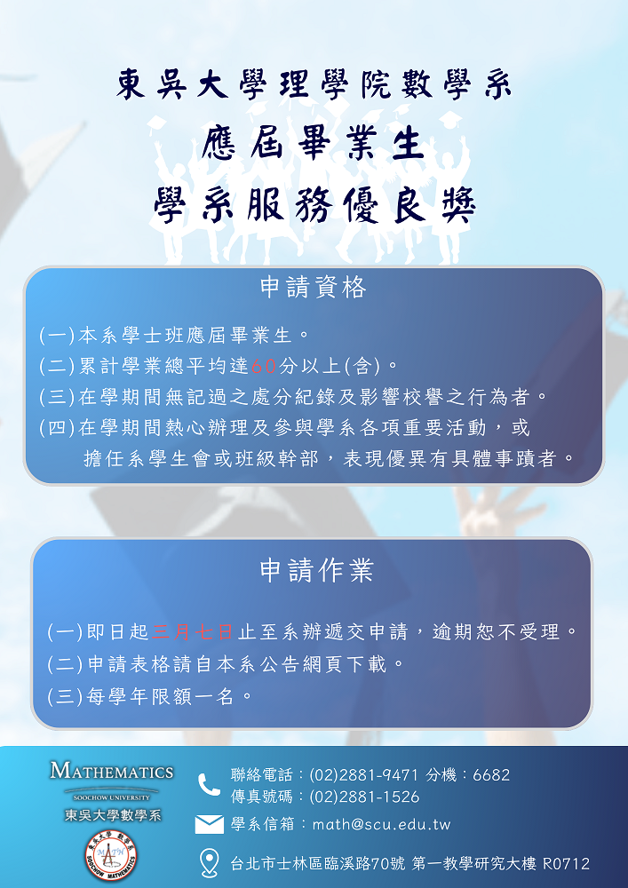 數學系應屆畢業生服務優良獎,即日起開始申請,申請截止日:114年3月7日(五)。