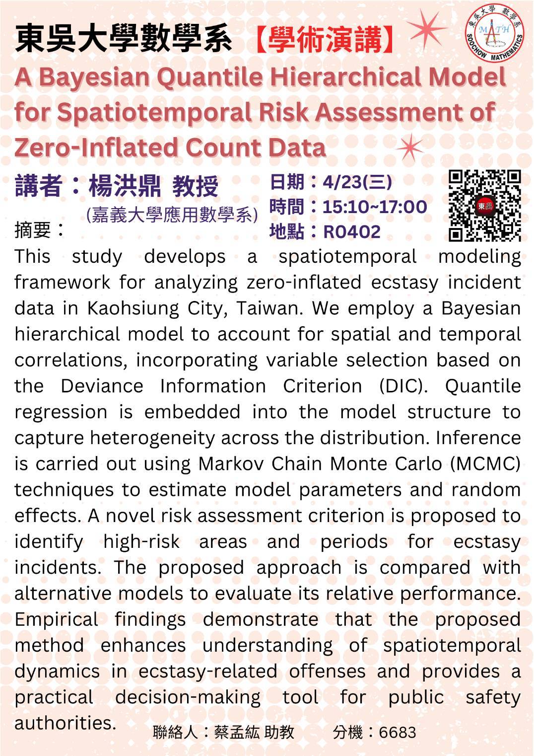 20250423【學術演講】A Bayesian Quantile Hierarchical Model for Spatiotemporal Risk Assessment of Zero-Inflated Count Data.