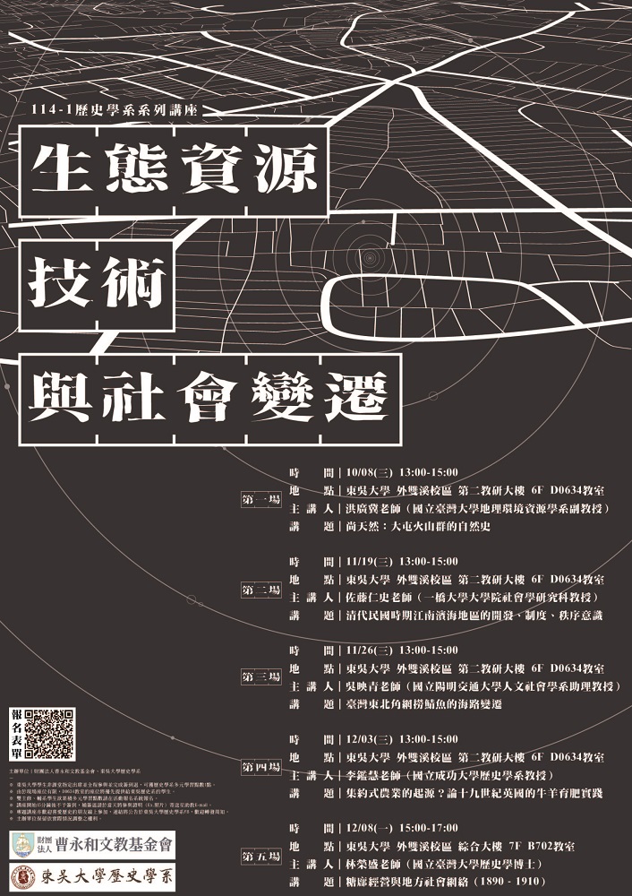 東吳大學歷史學系舉辦一系列以「生態資源、技術與社會變遷:從臺灣史到全球案例的探索」為主題的講座,敬請踴躍報名參加。