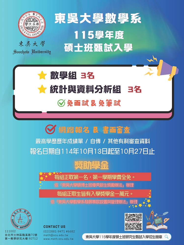 115學年度東吳大學數學系碩士班甄試入學資訊。