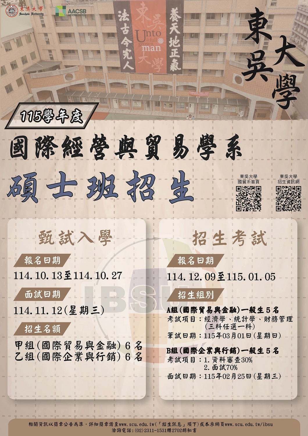 115學年度東吳大學國際經營與貿易學系碩士班甄試入學資訊。