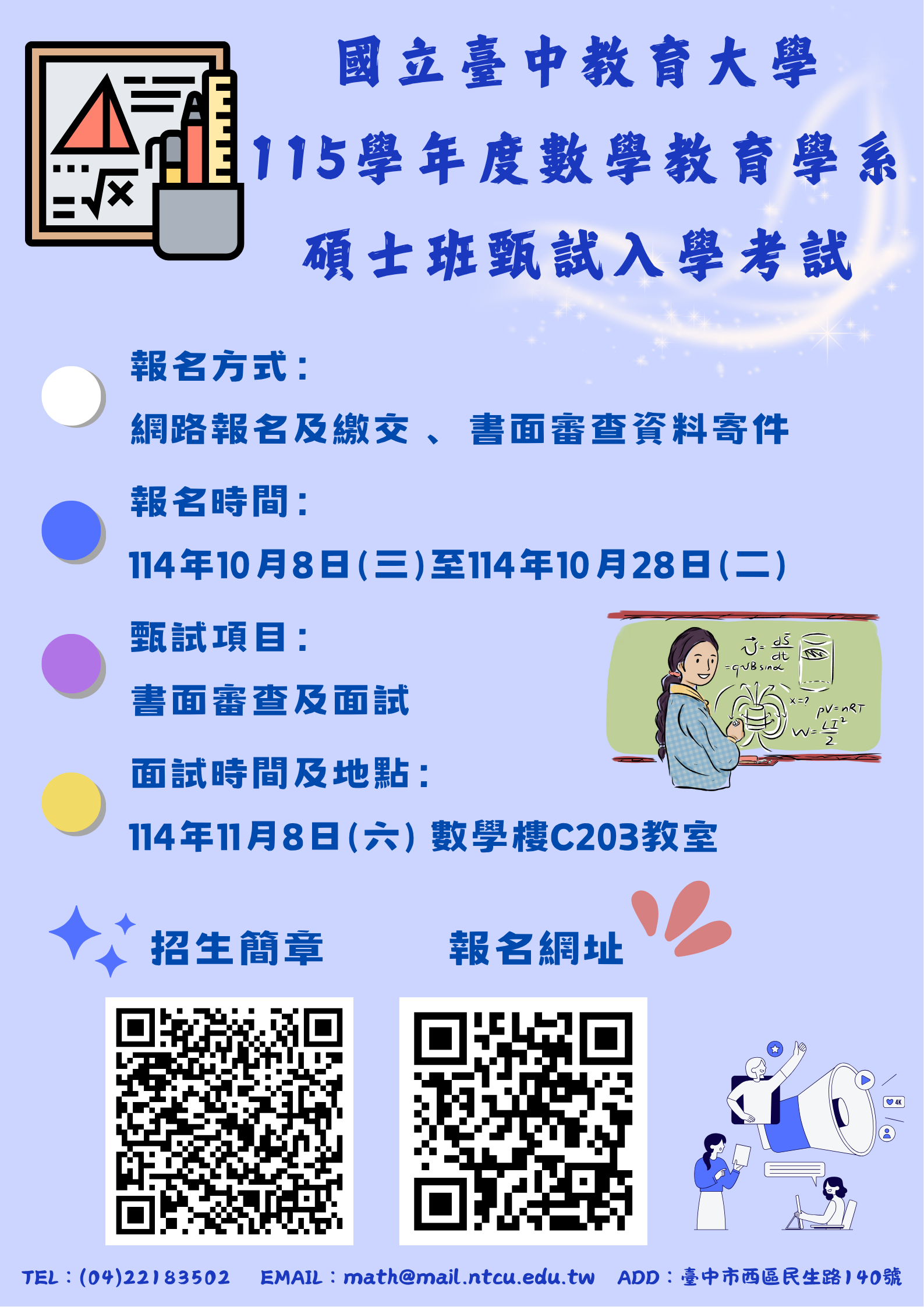 115學年度國立臺中教育大學數學教育學系碩士班甄試入學資訊。
