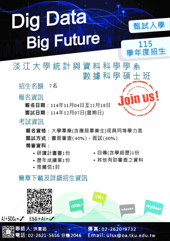115學年度淡江大學統計與資料科學學系數據科學碩士班招生訊息。
