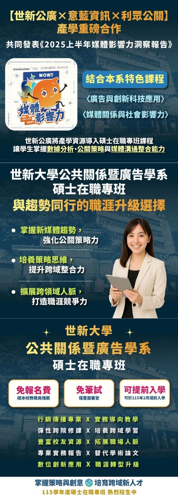 115學年度世新大學公共關係暨廣告學系碩士在職專班招生訊息。