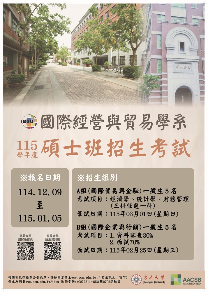 115學年度東吳大學國際經營與貿易學系碩士班招生訊息。