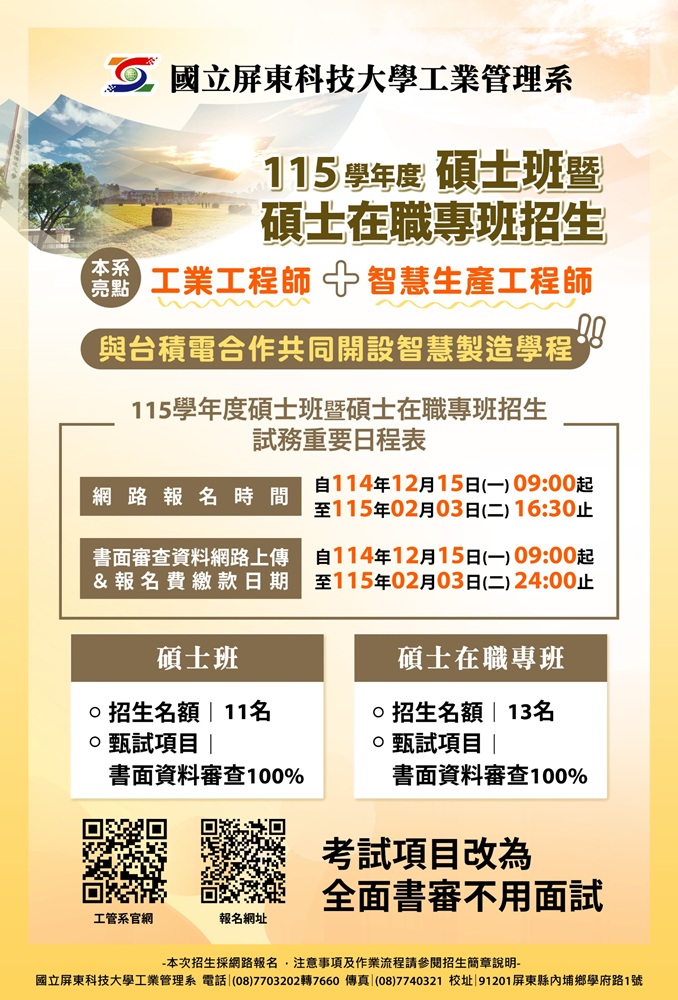 115學年度國立屏東科技大學工業管理系碩士班暨碩士在職專班招生考試訊息。