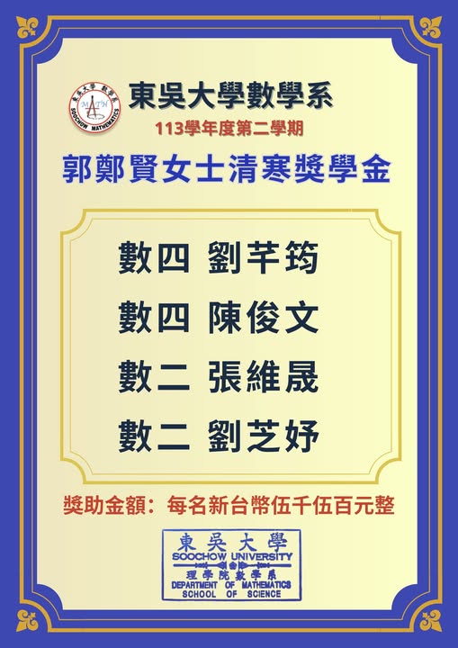 113學年度「數學系郭鄭賢女士清寒優秀獎助學金」獲獎名單。