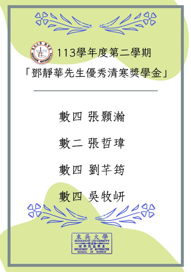 113學年度第2學期數學系「鄧靜華先生優秀清寒獎學金」獲獎名單。