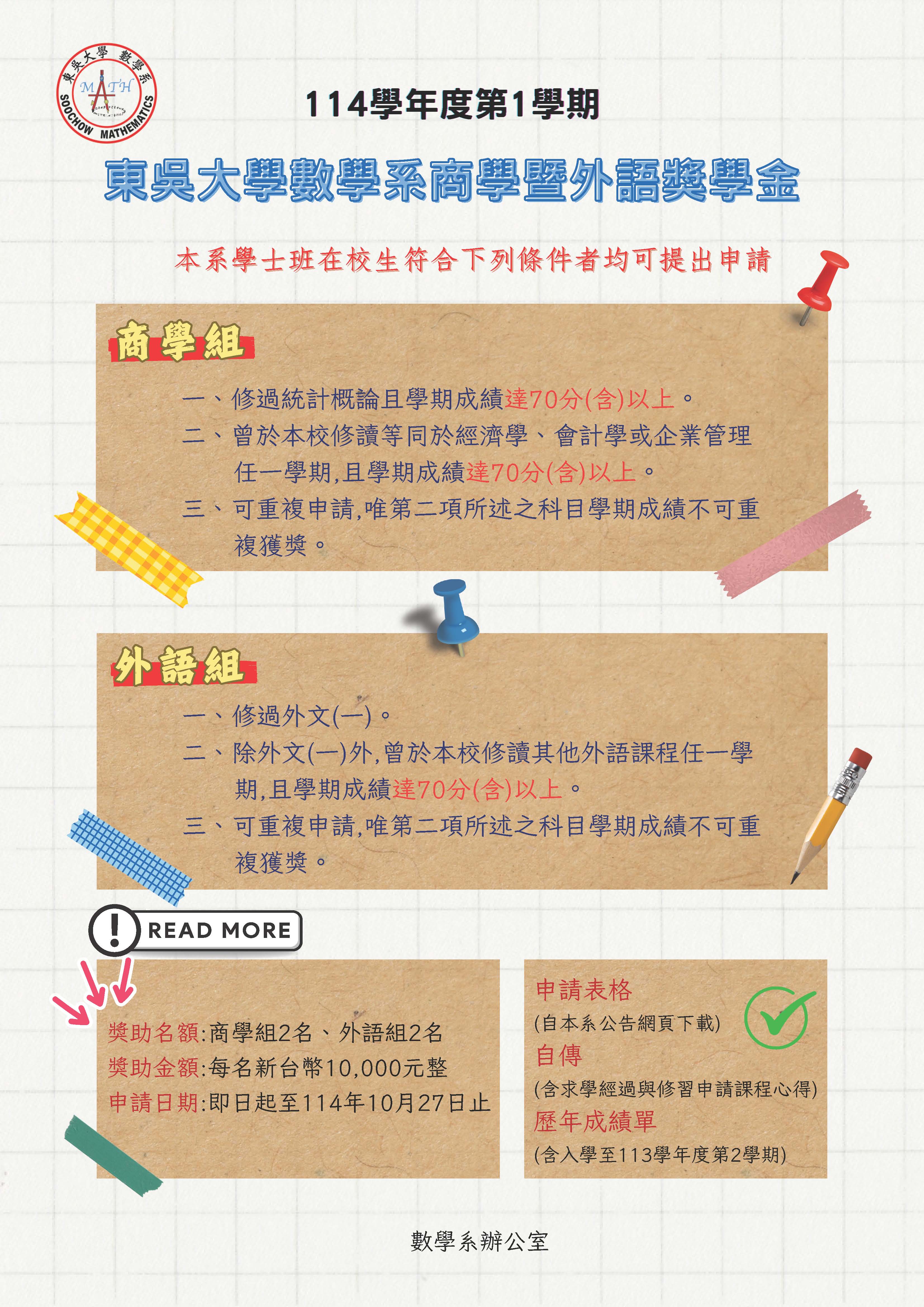 114學年度第1學期「東吳大學數學系商學暨外語獎學金」即日起開始申請,114年10月27日截止。