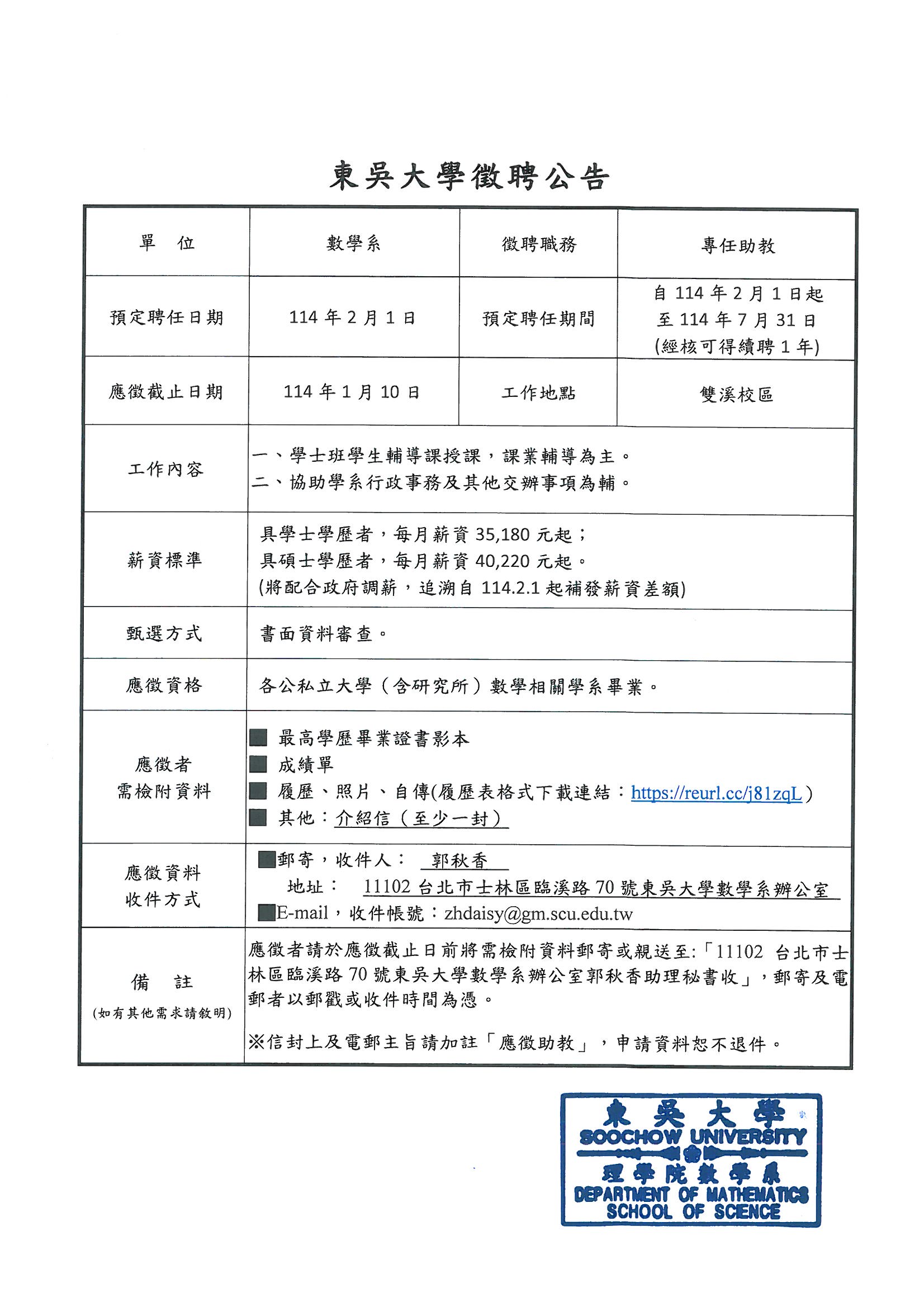 東吳大學數學系徵聘專任助教公告(114.01.10止)。