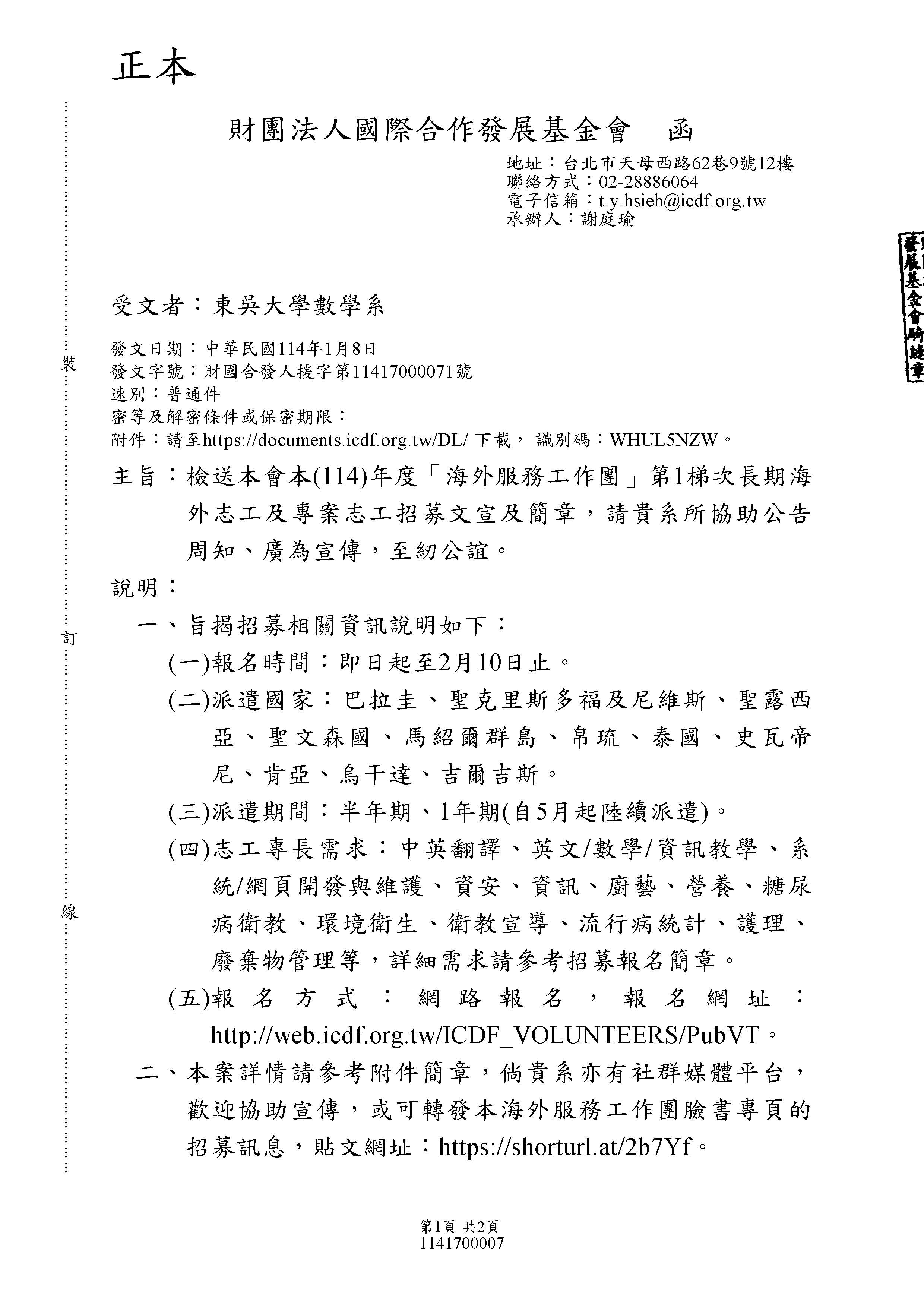 財團法人國際合作發展基金會114年度「海外服務工作團」第1梯次長期海外志工及專案志工招募文宣及簡章。
